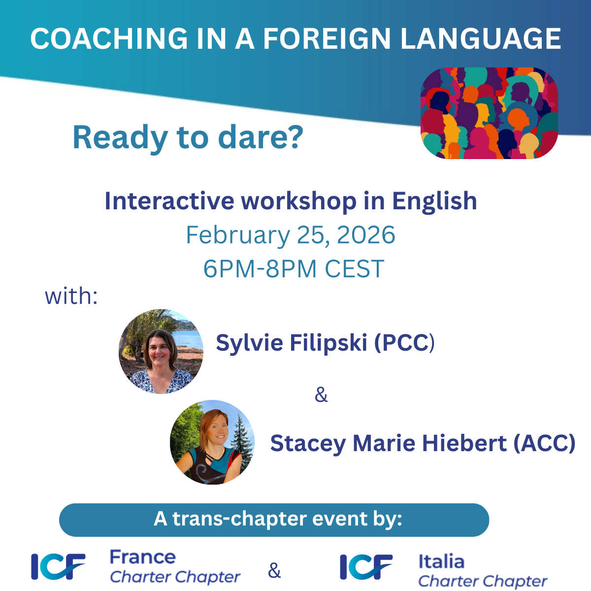 On February 25th from 6:00 PM to 8:00 PM, ICF France (Occitanie and Bourgogne Franche-Comté branches) is partnering with ICF Italia to offer you a unique experiential journey: “Coaching in a Foreign Language, Ready to Dare!”.